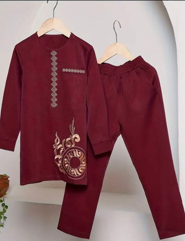 This elegant traditional 2piece set for boys in a rich red wine color, features a long-sleeve top and matching pants. Perfectly tailored for ages 10–14 it combines classic African style with a comfortable fit making it ideal for weddings parties, and special family celebrations.