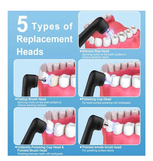 Comes with a complete set of replaceable polishing heads to target different areas of the mouth and extend the life of your device.