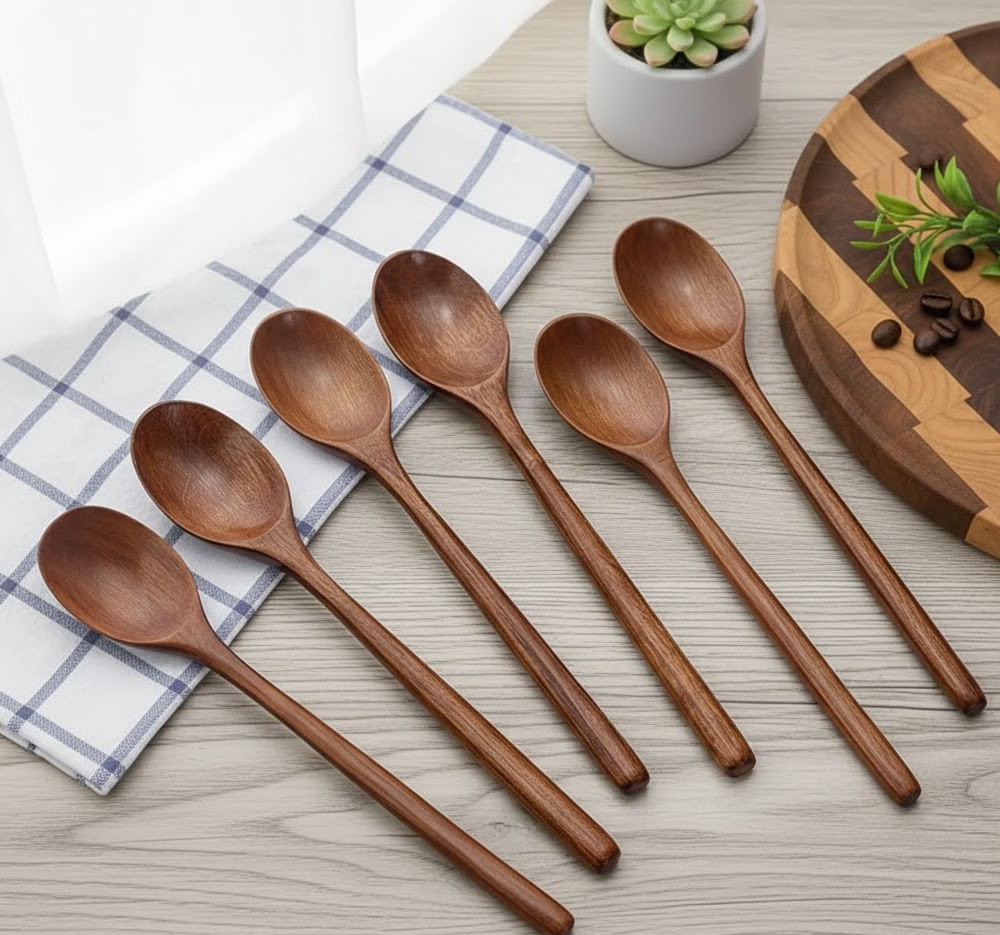 This 6pcs Multifunctional 9.25-Inch Long Handle WoodenSpoon Set, designed for versatility, durability, and everyday convenience. This complete set includes a soup ladle, dessert spoon, coffee spoon, stirring spoon, and other essential serving spoon perfect for cooking, baking, and serving a wide variety of dishes.