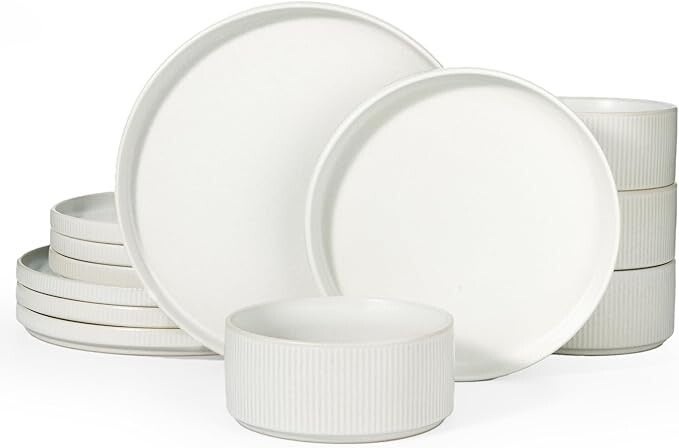 Star Dinnerware Sets – Plates and Bowls Set for 4 12-Piece, Ribbed Design, Cappuccino White
